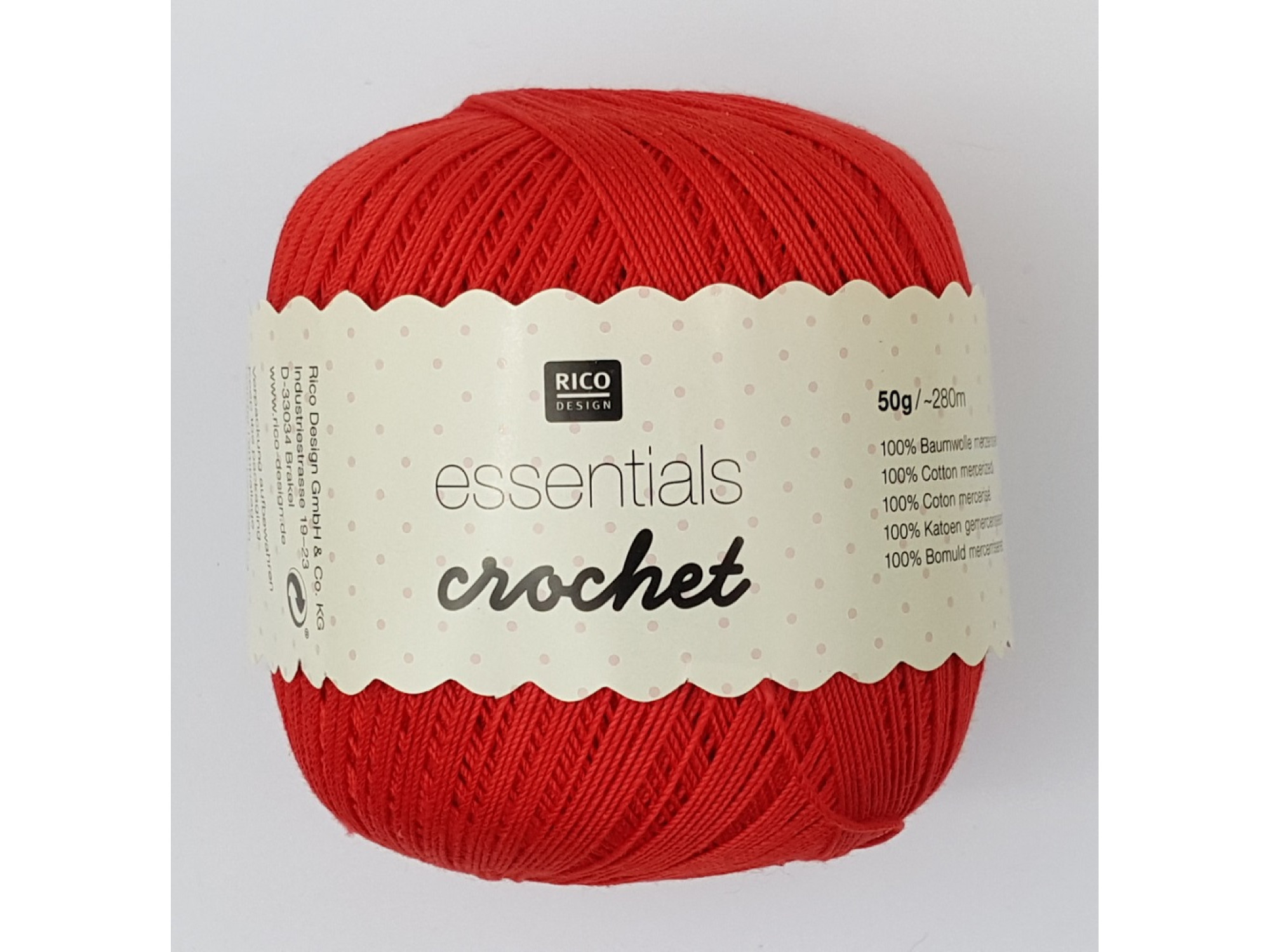 Essentials Crochet in 100% mercerized cotton. In a wide range of glorious shades this cotton is perfect for delicate lacey patterns, fine craft work, edging and trims. A gentle wash at 30 degrees advised.
